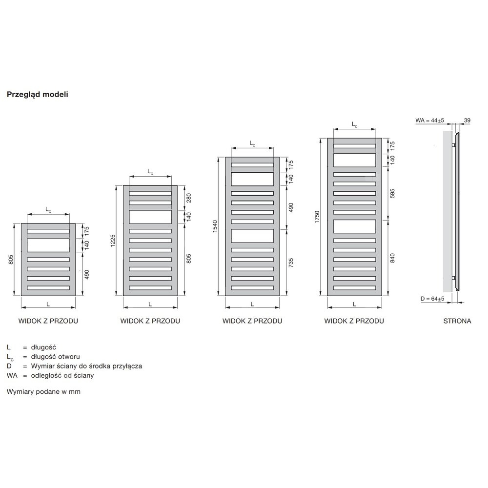 Nowoczesny płaski front z otworami na ręczniki, oryginalny trójkątny kolektor, przyłącze środkowe 50mm, możliwość zamontowania haczyka na ręczniki