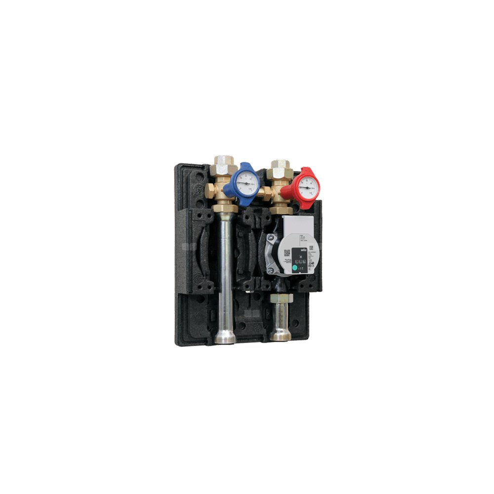 z termometrami, zawór zwrotny, łupinę izolacyjną EPP z mocowaniem, złączki i mocowanie ścienne.