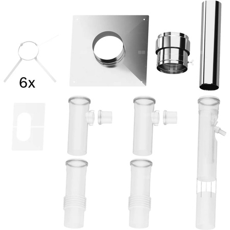 Zestaw podstawowy C(14)3x (3190), pionowy zestaw spalinowy do przewodów sztywnych fi125 z odprowadzeniem kondensatu, dla pierwszego kotła, tworzywo polimerowe PP:trójnik fi80/fi125/fi125, przewód z kompensacją fi125 L = 429 mm, 7 x element dystansowy, z