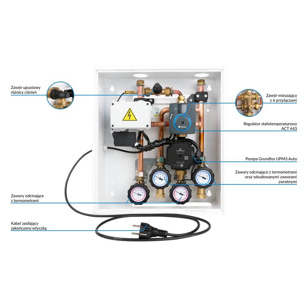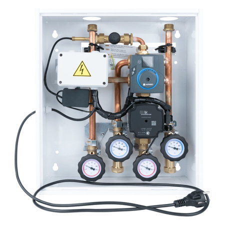 ACB 930 - prosty w obsłudze zestaw do kotła nie obsługującego zaworu mieszającego, kiedy w domu jest sterowanie strefowe. Wyposażony w regulator stałotemperaturowy ACT 443 ProClick, który utrzymuje cały czas stałą temperaturę zasilania, niezależnie od temperatury w pomieszczeniu i na zewnątrz.
