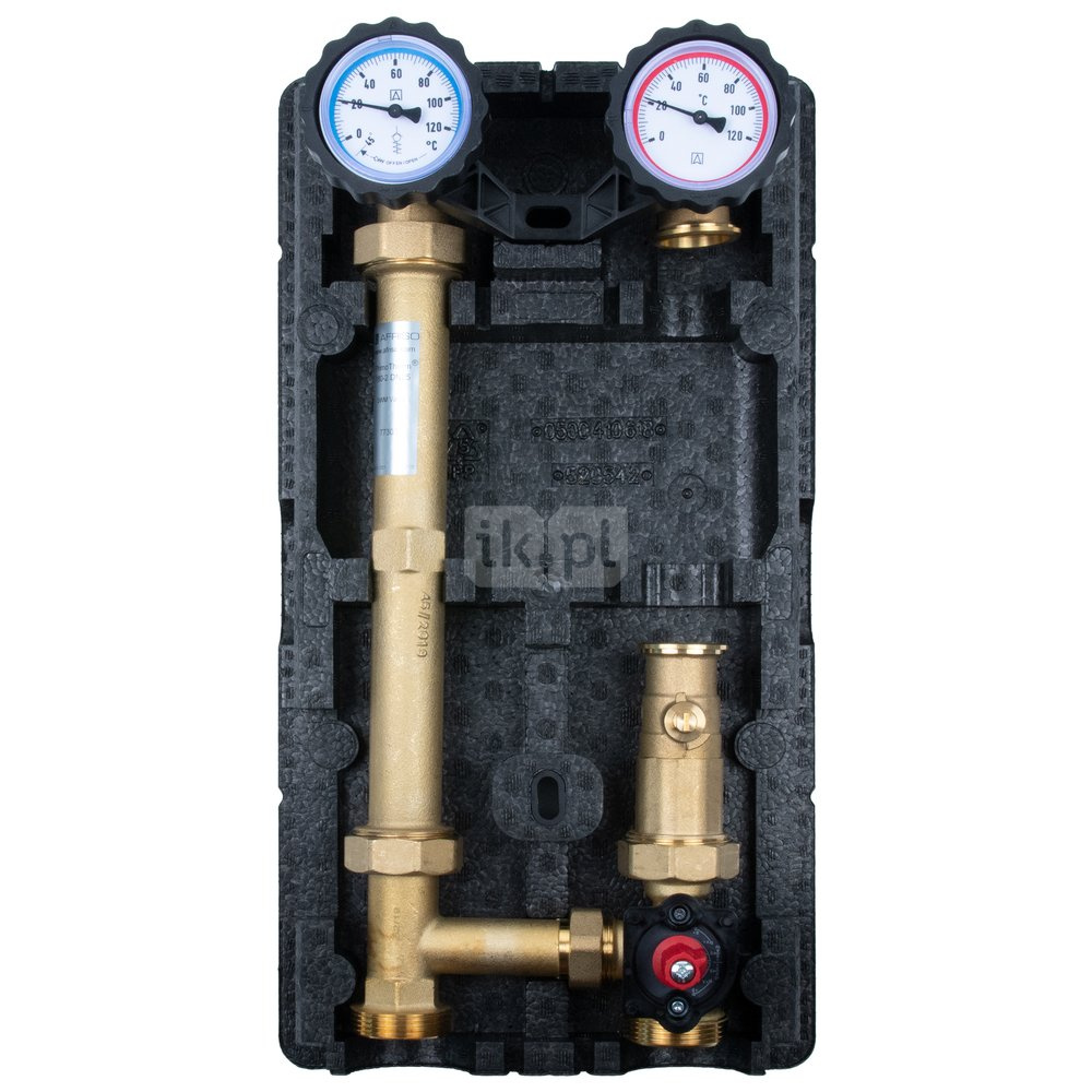 - Wyposażona w niezbędne komponenty: termometry, zawór zwrotny, zawory odcinające na zasilaniu i powrocie, zawór odcinający przed pompą i izolację termiczną.