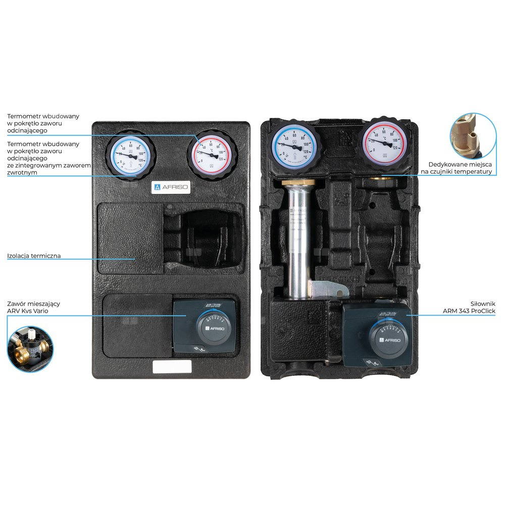 Grupa pompowa AFRISO PrimoTherm K 180-2 DN 25 3-WM-SM GZ x GW 1 1/2'' x 1'', z zaworem mieszającym, z siłownikiem arm 343 proclick