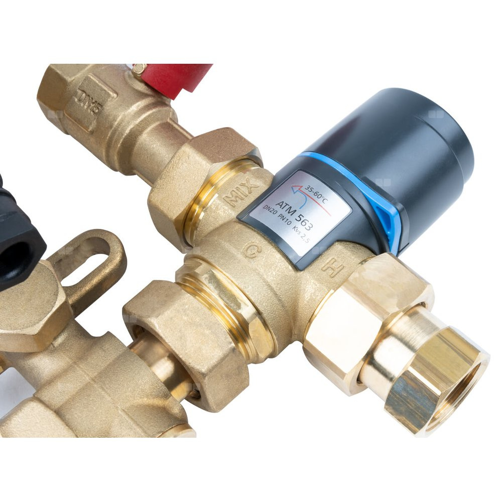 Niezbędna armatura: zawór termostatyczny ATM, termometr z wbudowanym zaworem odcinającym, wbudowany zawór zwrotny, zawór odcinający, zawór upustowo-odpowietrzający.