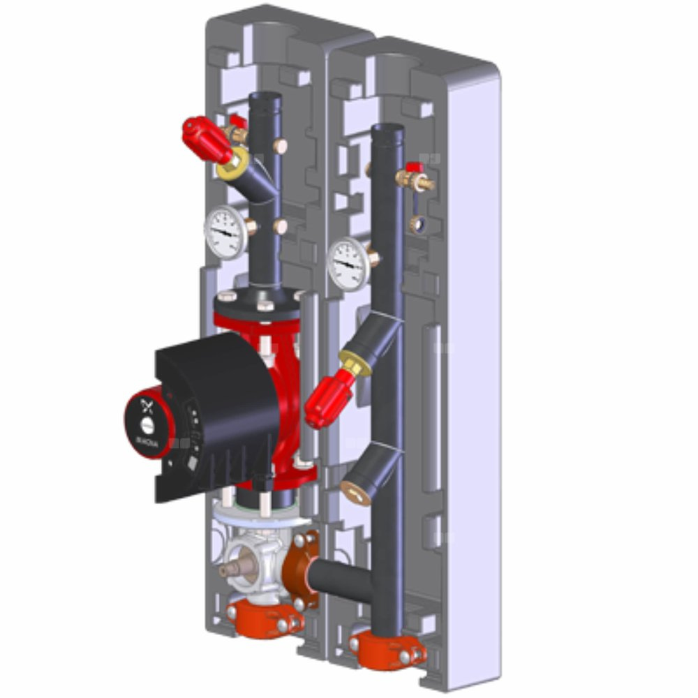 Grupa pompowa kołnierzowa DN 40 - 65 do dystrybucji ciepła do 2300 kW. (obieg grzewczy z podmieszaniem do dużego rozdzielacza do 2300 kW) Uzupełnienie systemu dużych rozdzielaczy, z pompą obiegową lub bez; rozstaw osi od 250 mm, 3 zawory odcinające, zintegrowany zawór zwrotny, 3 drogowy zawór mieszający, 3 zawory kulowe napełniająco-spustowe, 2 termometry, dodatkowe przyłącza 1/2" na zasilaniu i na powrocie, filtr siatiowy, orurowanie i części przyłączeniowe, w tym Złączki BigFixLock do rozdzielacza (przyłącze DN 50 dla wszystkich modeli), stalowa bez szwu zgodnie z wymiarami pompy, izolacja EPP.