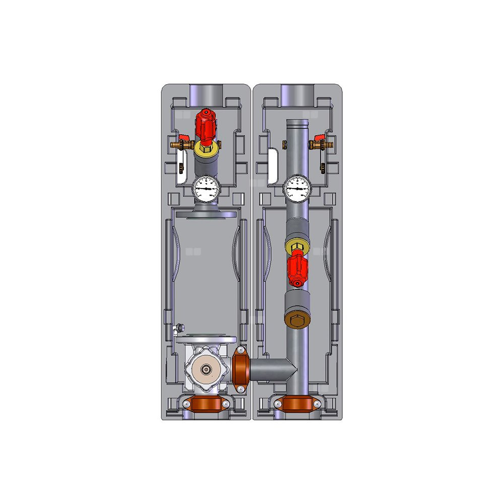 Uzupełnienie systemu dużych rozdzielaczy, z pompą obiegową lub bez; rozstaw osi od 250 mm, 3 zawory odcinające, zintegrowany zawór zwrotny, 3 drogowy zawór mieszający, 3 zawory kulowe napełniająco-spustowe, 2 termometry, dodatkowe przyłącza 1/2" na zasilaniu i na powrocie, filtr siatiowy, orurowanie i części przyłączeniowe, w tym Złączki BigFixLock do rozdzielacza (przyłącze DN 50 dla wszystkich modeli), stalowa bez szwu zgodnie z wymiarami pompy, izolacja EPP.