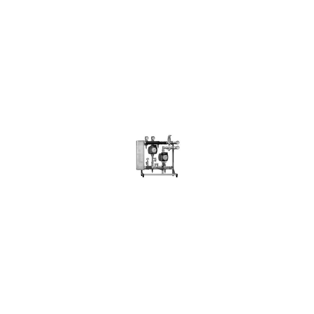 Stacja solarna wymiennikowa, komplet z dwiema pompami obiegowymi, lutowanym miedzią płytowymwymiennikiem ciepła ze stali szlachetnej łącznie z izolacją, dwoma ogranicznikami objętości strumienia, dwoma zaworami bezpieczeństwa i manometrami, odpowietrznikiem (po stronie wtórnej), odmulnikiem (po stronie wtórnej), armaturą odcinającą z uchwytami termometrów (od strony zasilania, po stronie powrotu z zaworem zwrotnym), ramą montażową z profili aluminiowych i stopkach z regulowaną wysokością.