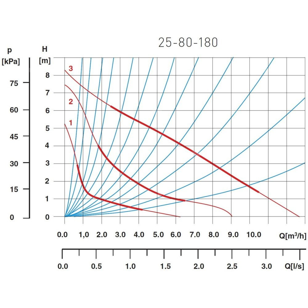 Model 25-80 Zakres funkcjonowania 0,1 - 10,5 m³/h Wysokość podnoszenia max. 8 m Temperatura cieczy min. +2°C, max. +110°C Zastosowanie ta pompa cyrkulacyjna jest przeznaczona wyłącznie dla wody pitnej Maksymalne ciśnienie 10 bar Klasa ochrony IP 44 Klasa izolacji H Dławik kabla PG 9 Instalacja z osią wału w pozycji poziomej i ze skrzynką zaciskową umieszczoną dowolnie, lecz nie pod pompą Napięcie 50-60 Hz, ~230V Pobór mocy (I,II,III) 135/190/245 W Rozstaw przyłączy 180 mm Przyłącze G1 1/2 Temperatura otoczenia min. +2°C, max. +40°C