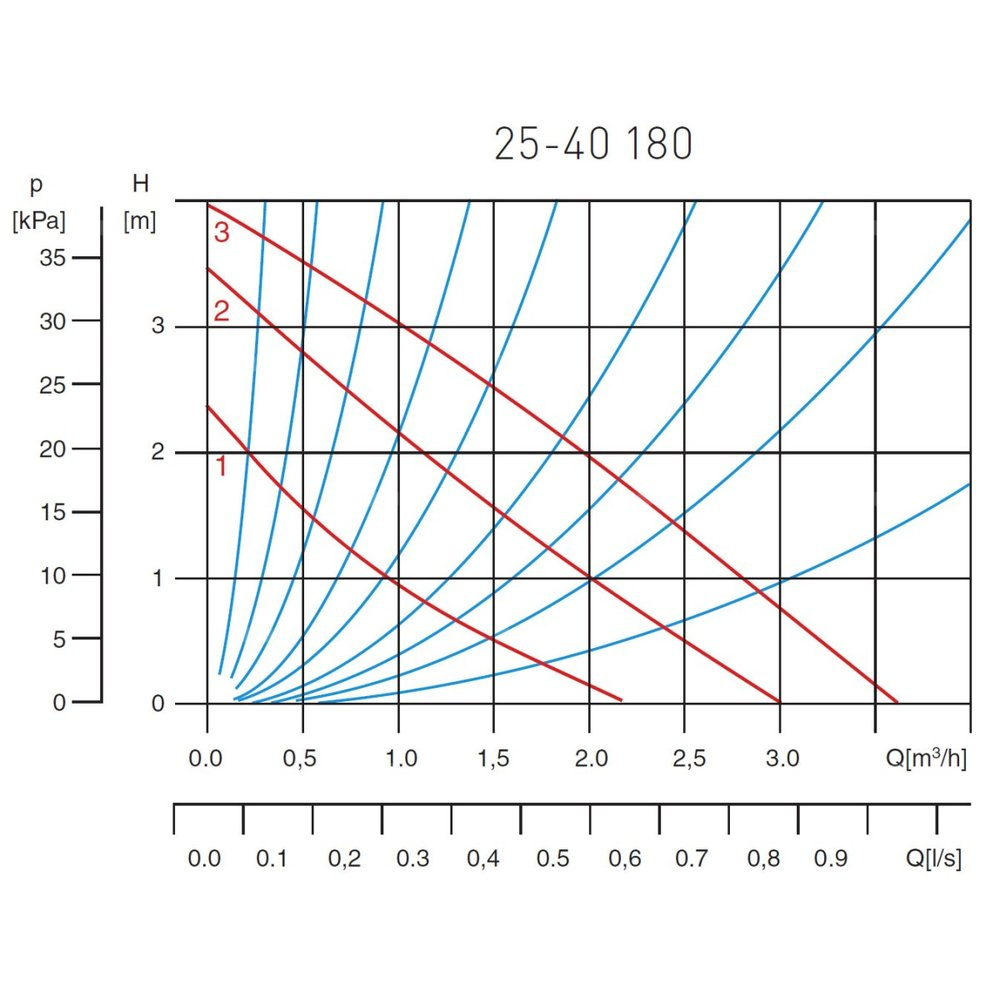 Model 25-40 180. Zakres funkcjonowania 0,2 - 3,5 m3/h. Wysokość podnoszenia max. 3,8 m. Temperatura cieczy min. +2°C, max. +110°C Rodzaj pompowanej cieczy - ta pompa cyrkulacyjna jest przeznaczona wyłącznie dla wody pitnej. Maksymalne ciśnienie 10 bar. Klasa ochrony IP 44. Klasa izolacji H. Dławik kabla PG 11. Instalacja z osią wału w pozycji poziomej i ze skrzynką zaciskową umieszczoną dowolnie, lecz nie pod pompą. Napięcie 50-60 Hz, ~230V. Pobór mocy (I,II,III) 35/45/65 W. Rozstaw przyłączy 180 mm. Przyłącze G1 1/2. Temperatura otoczenia min. +2°C, max. +40°C.