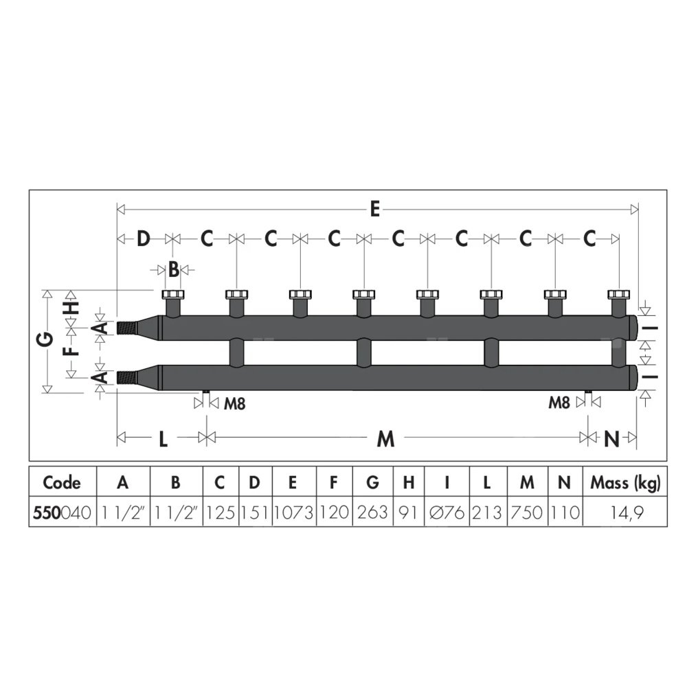 Rozdzielacz do instalacji grzewczych i chłodniczych. Wykonany ze stali.