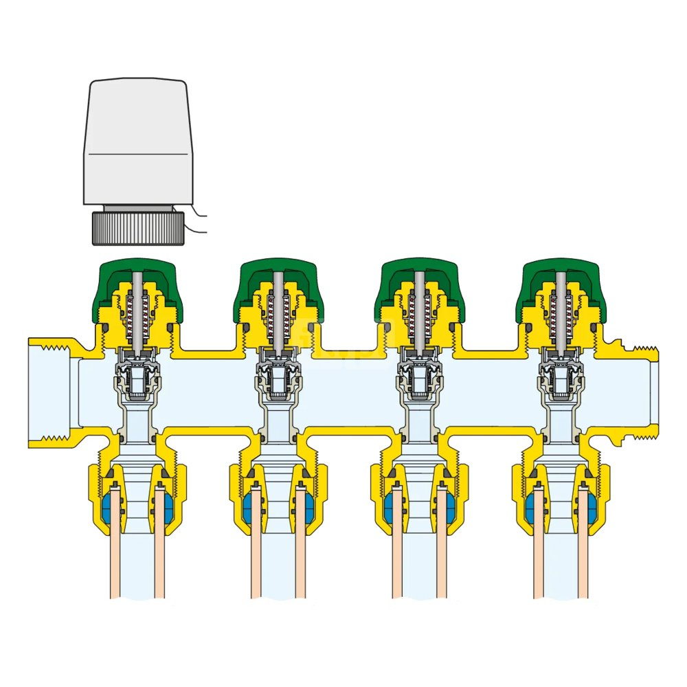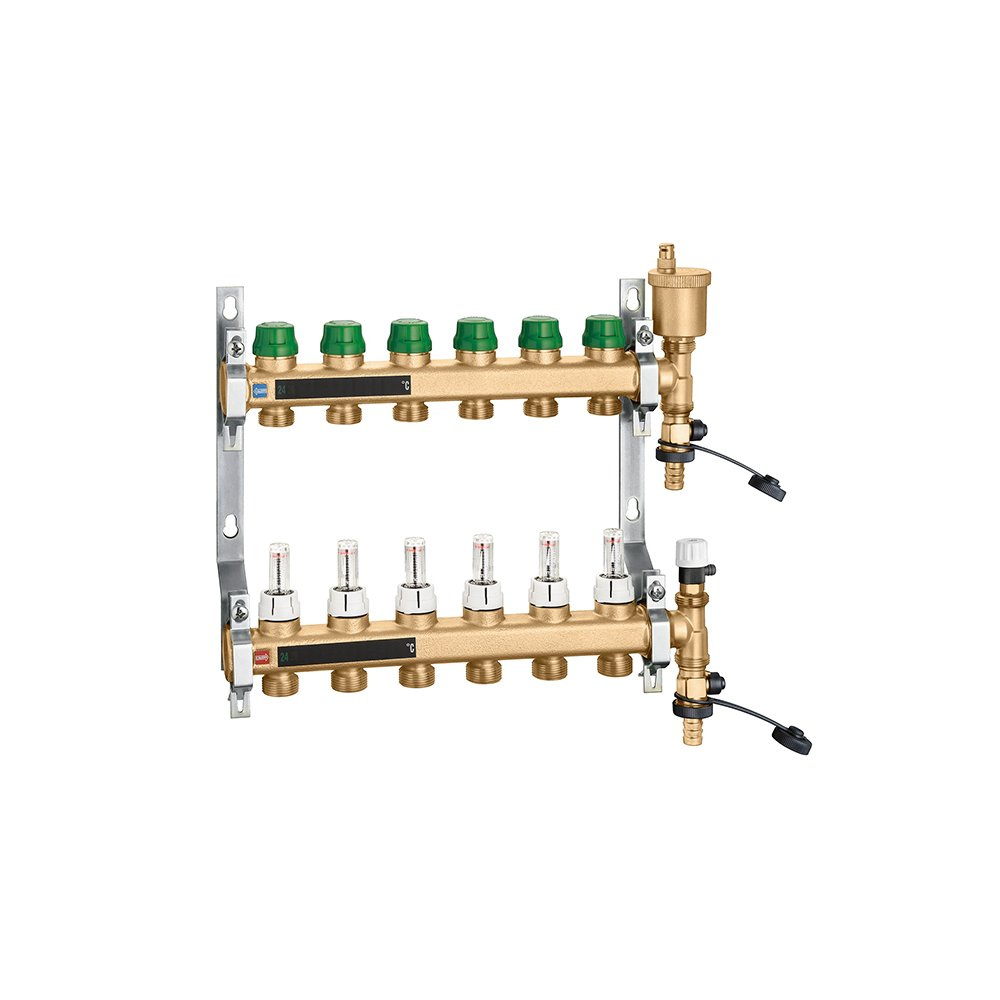 Zespół rozdzielaczy Zawiera: - rozdzielacz powrotny z wkładkami równoważącymi DYNAMICAL® przystosowanymi do współpracy z siłownikami elektrotermicznymi, zakres regulacji 25÷170 l/h; - rozdzielacz zasilania z przepływomierzami; - zakończenie rozdzielacza z automatycznym odpowietrznikiem z kapturkiem higroskopijnym i zaworem spustowym; - stalowe uchwyty montażowe do zastosowania w skrzynkach lub bezpośrednio na ścianie. główne podłączenie: G 1" (ISO 228-1) GW, Podłączenie do złączek Caleffi. przyłącza wylot: G 3/4" A (ISO 228-1) GZ, 4 wyjścia. Maksymalne ciśnienie pracy: 6 bar. Zakres temperatury medium: 5–60 °C. Rozstaw wyjść: 50 mm. Zakres regulacji natężenia przepływu: 25–150 l/h.