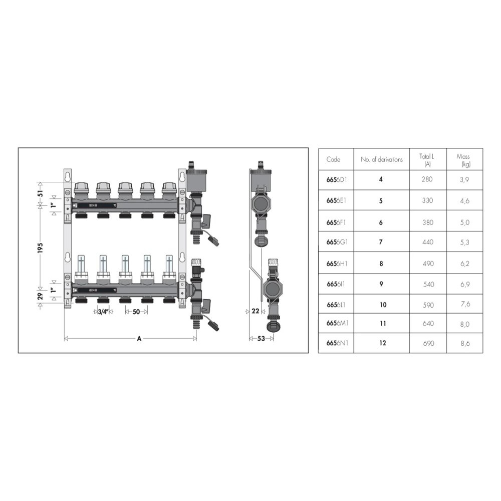 Zespół rozdzielaczy Zawiera: - rozdzielacz powrotny z wkładkami równoważącymi DYNAMICAL® przystosowanymi do współpracy z siłownikami elektrotermicznymi, zakres regulacji 25÷170 l/h; - rozdzielacz zasilania z przepływomierzami; - zakończenie rozdzielacza z automatycznym odpowietrznikiem z kapturkiem higroskopijnym i zaworem spustowym; - stalowe uchwyty montażowe do zastosowania w skrzynkach lub bezpośrednio na ścianie. główne podłączenie: G 1" (ISO 228-1) GW, Podłączenie do złączek Caleffi. przyłącza wylot: G 3/4" A (ISO 228-1) GZ, 7 wyjść. Maksymalne ciśnienie pracy: 6 bar. Zakres temperatury medium: 5–60 °C. Rozstaw wyjść: 50 mm. Zakres regulacji natężenia przepływu: 25–150 l/h.