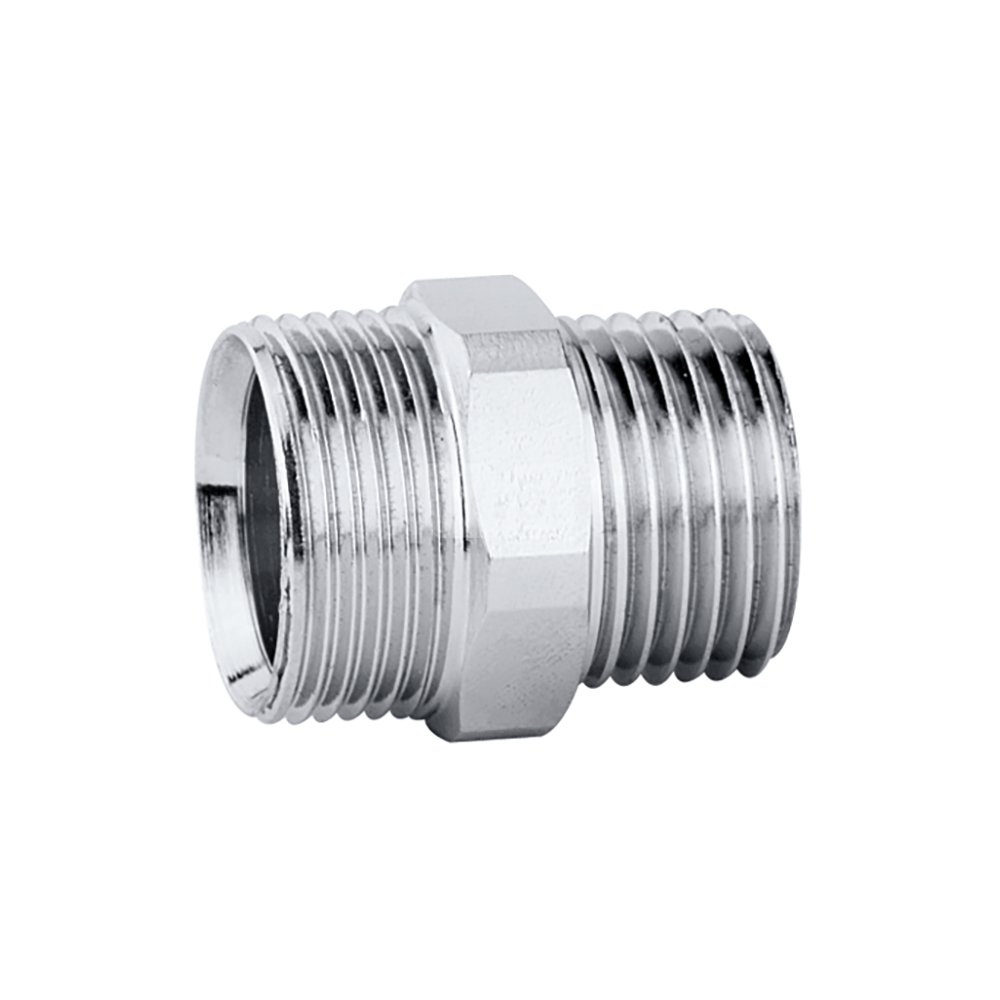 Nypel GZ-GZ Przyłącze: 23 p. 1,5, wlot, uszczelka, Podłączenie do złączek Caleffi. Przyłącze: G 1/2" A (ISO 228-1) GZ, wylot. Wykończenie: chromowane.