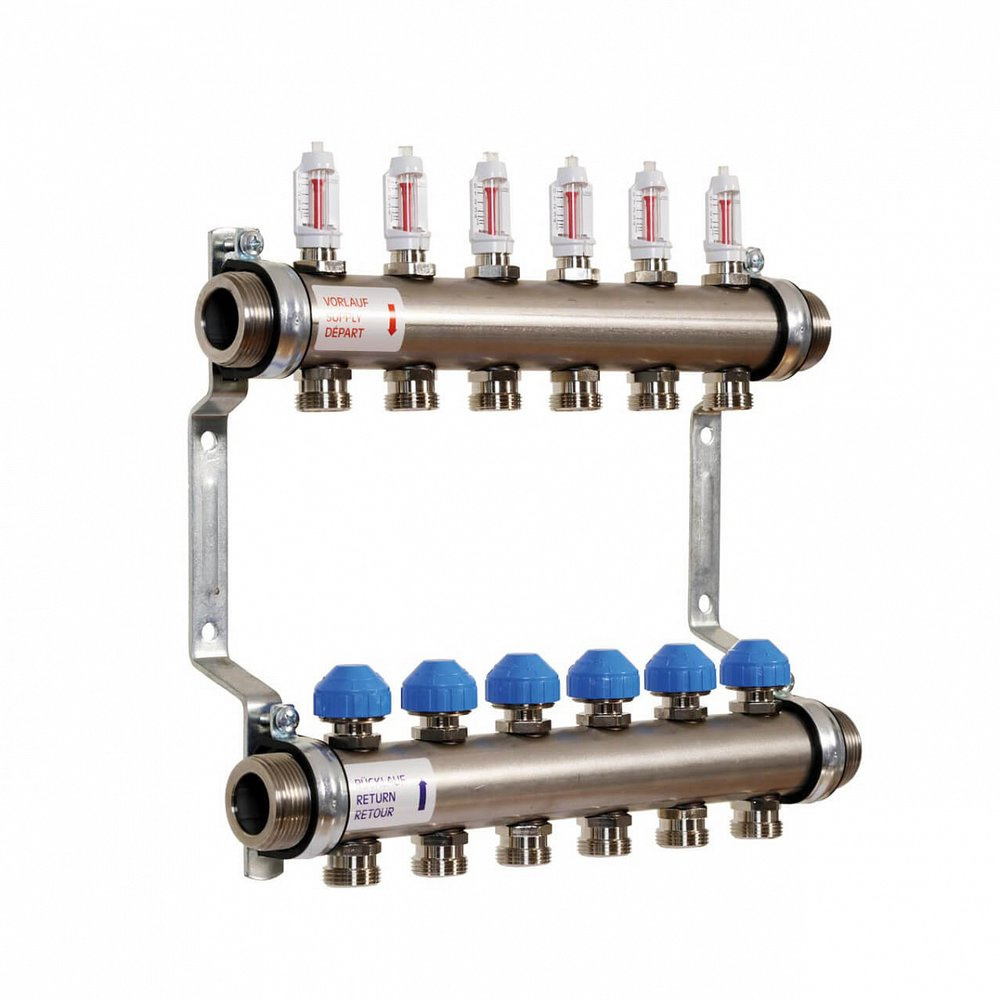 Rozdzielacz z rury okrągłej ze stali nierdzewnej zgodny z normą DIN EN 1264-4. Złącze płaskie uszczelniające męskie 1 ¼" po obu stronach dla akcesoriów rozdzielacza i stacji pomp kontrolnych. Przepływomierze odcinające o bardzo małej stracie ciśnienia. Wskazanie przepływu 0-4 l/min lub 0-6 l/min. Zawory regulacyjne i odcinające z adaptacją M30x1,5. Punkt zamknięcia 11,8 mm. Nypel przyłączeniowy G ¾" Euro stożek. Odległość środkowa między wylotami: 50 mm. Rura zasilająca na górze, gotowy montaż na uchwycie ściennym, zaciski rurowe wygłuszone zgodnie z DIN 4109.