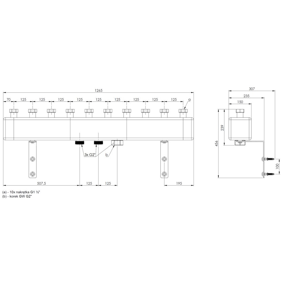 Pięć par przyłączy zasilających i powrotnych obiegów pompowych.