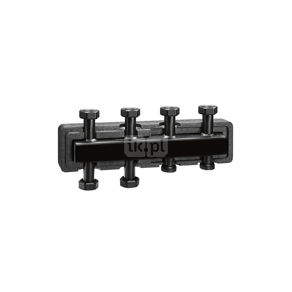 Rozdzielacz do instalacji grzewczych i chłodniczych. 2+1 wyjścia. Z izolacją. W komplecie ze wspornikami ze stali. główne podłączenie: G 1 1/2" A (ISO 228-1) GZ. przyłącza wylot: G 1 1/2" (ISO 228-1) GW, 1 wyjście, nakrętka mocująca. Maksymalne ciśnienie pracy: 6 bar. Zakres temperatury medium: 5–110 °C. Rozstaw przyłączy głównych: 125 mm. Materiał: stal.