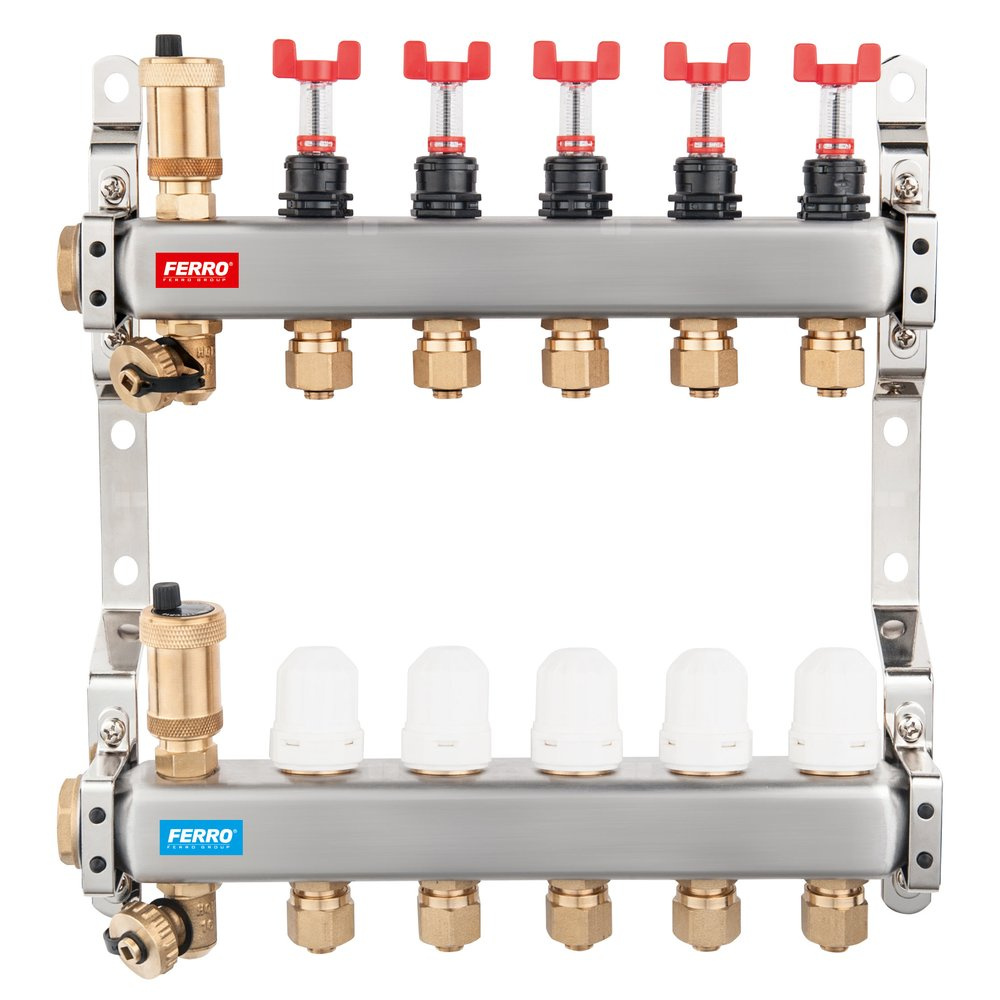 Rozdzielacz do ogrzewania podłogowego FERRO SN-RZP03S 3-obieg. stal nierdzewna gw 1'' x nypel gw 1/2''x3/4'' + przepływomierz + termostat