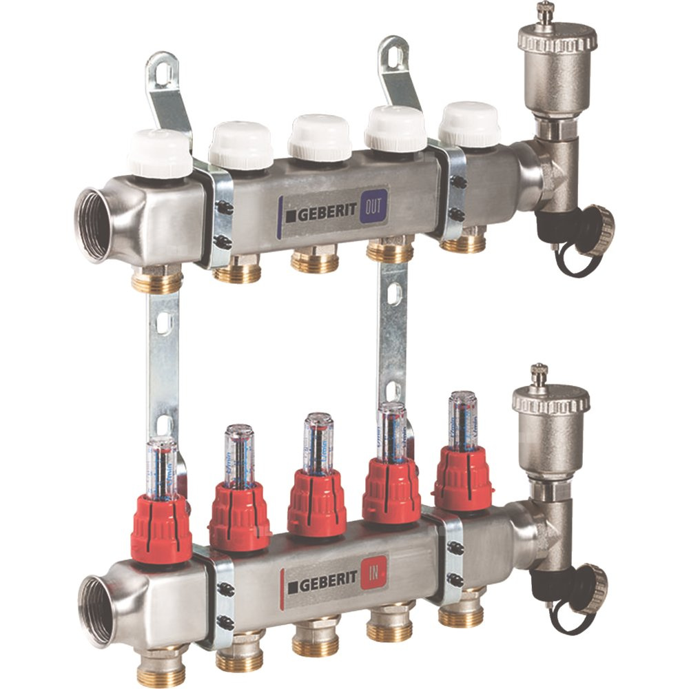 Rozdzielacz do ogrzewania podłogowego GEBERIT Volex 5-obieg. stal nierdzewna gw 1'' x eurokonus 3/4'' + przepływomierz + zawór napełn/spust + odpowietrznik