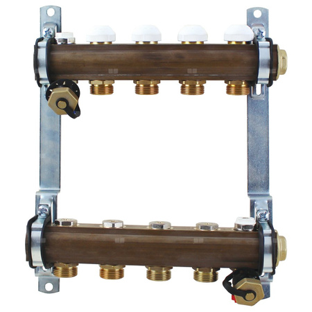Zespół rozdzielaczy drążkowych HERZ do ogrzewania podłogowego, DN 25, wykonanie żółte, Części składowe: rozdzielacz zasilający z wkładkami odcinającymi, rozdzielacz powrotny z wkładkami termostatycznymi, spust z przyłączem do węża, odpowietrzenie, kołpaki końcowe, uchwyty. Gwint przyłączeniowy wewnętrzny Rp 1. Króćce wyjściowe G 3/4 ze stożkiem.
