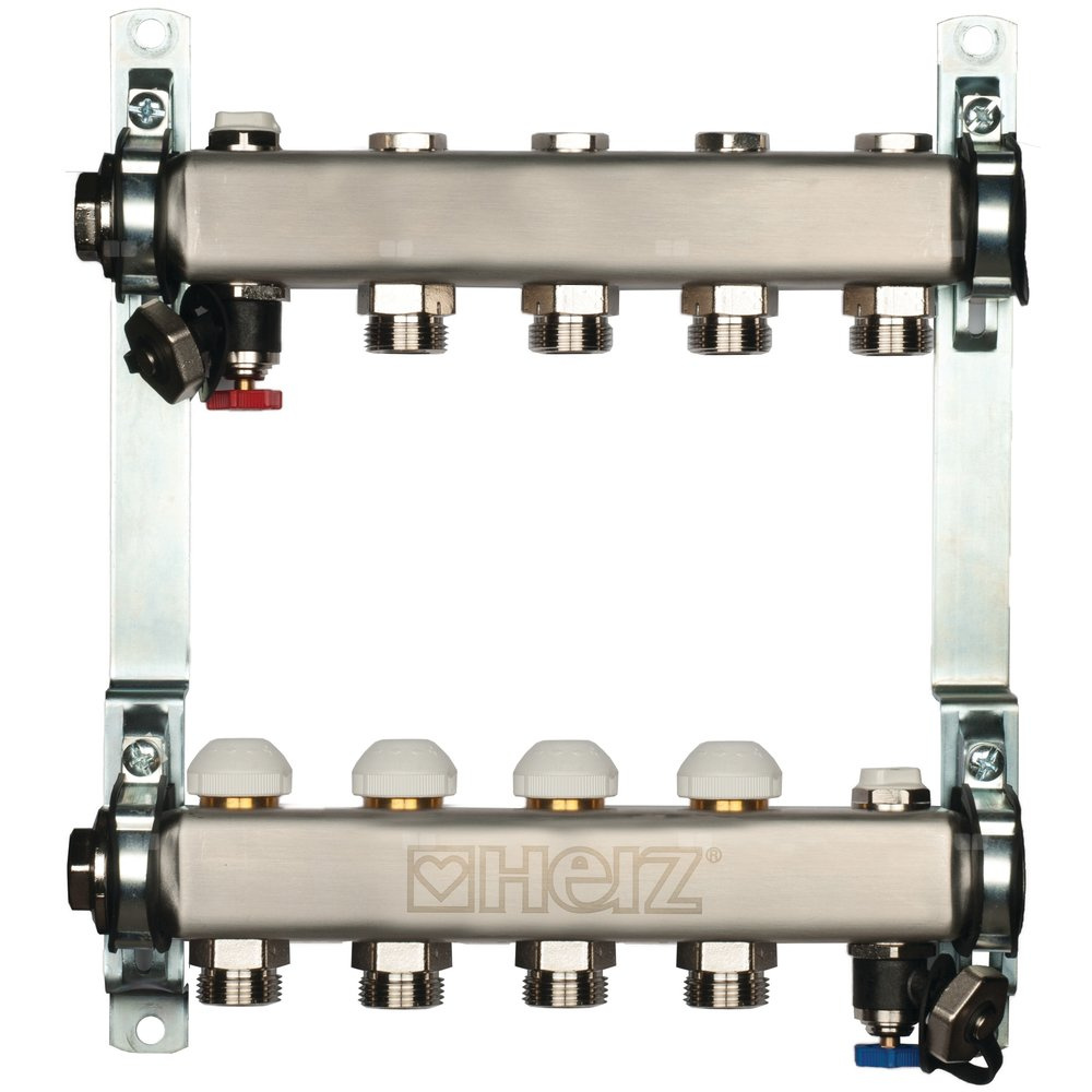 Rozdzielacz do ogrzewania podłogowego HERZ 5-obieg. stal nierdzewna GW 1'' x GZ 3/4'' + zawór napełn/spust + odpowietrznik