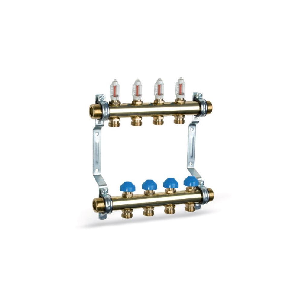 Kolektor ogrzewania rur z mosiądzu według EN 1264-4. Płaskie połączenia uszczelniające 1 ”m. Niska głębokość instalacji. Połączenie sutka G3/4 ”z eurocone, odległość 50 mm. Przetestowane funkcje i ciśnienie. Dostawa: Flowmeter 0 - 4 l/min z funkcją niskiego ciśnienia i funkcją odcinania. Powrót: Zawór sterujący i odcinający z adaptacją M30 x 1,5.