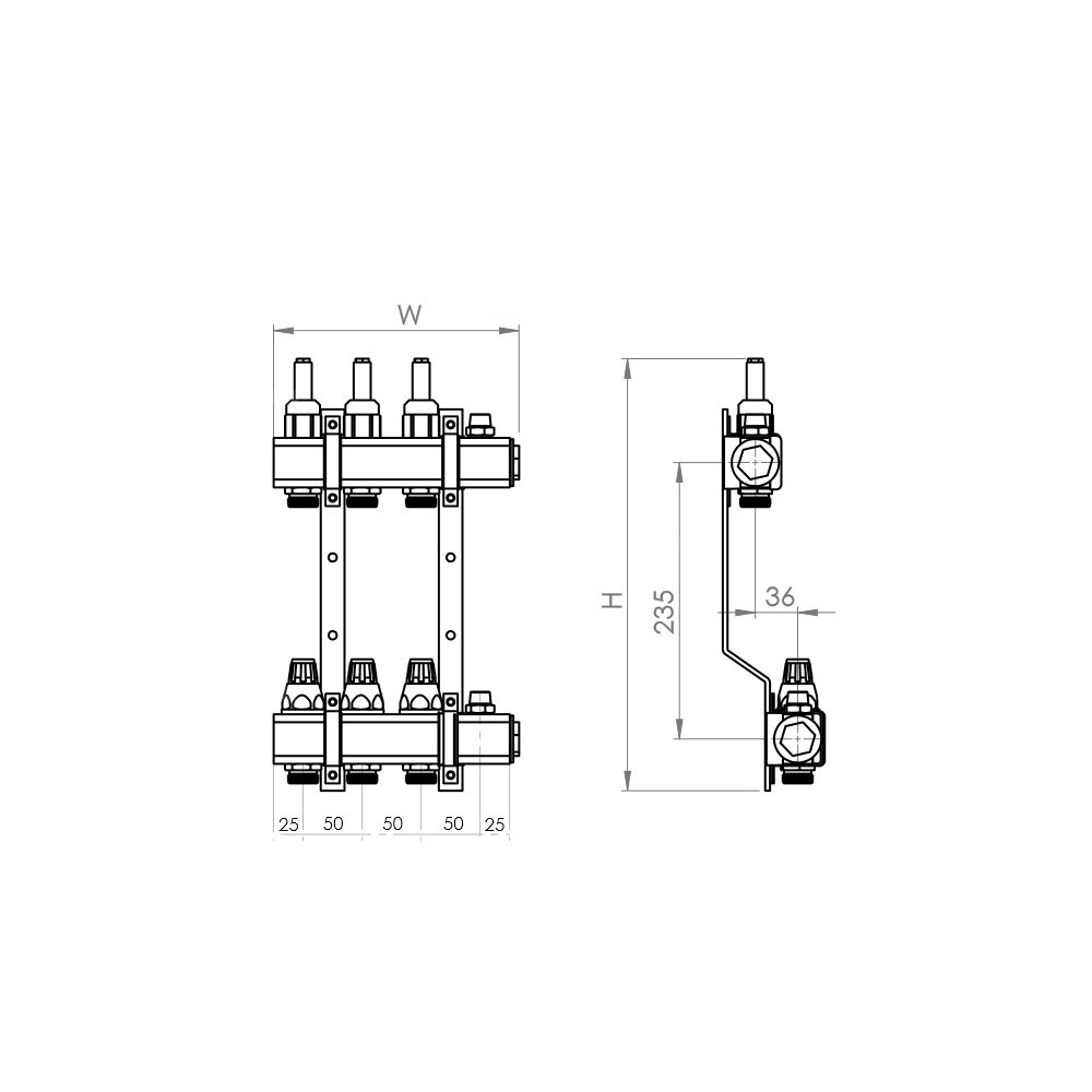 Rozdzielacz mosiężny z zaworami i zaworami termostatycznymi 309x346x87