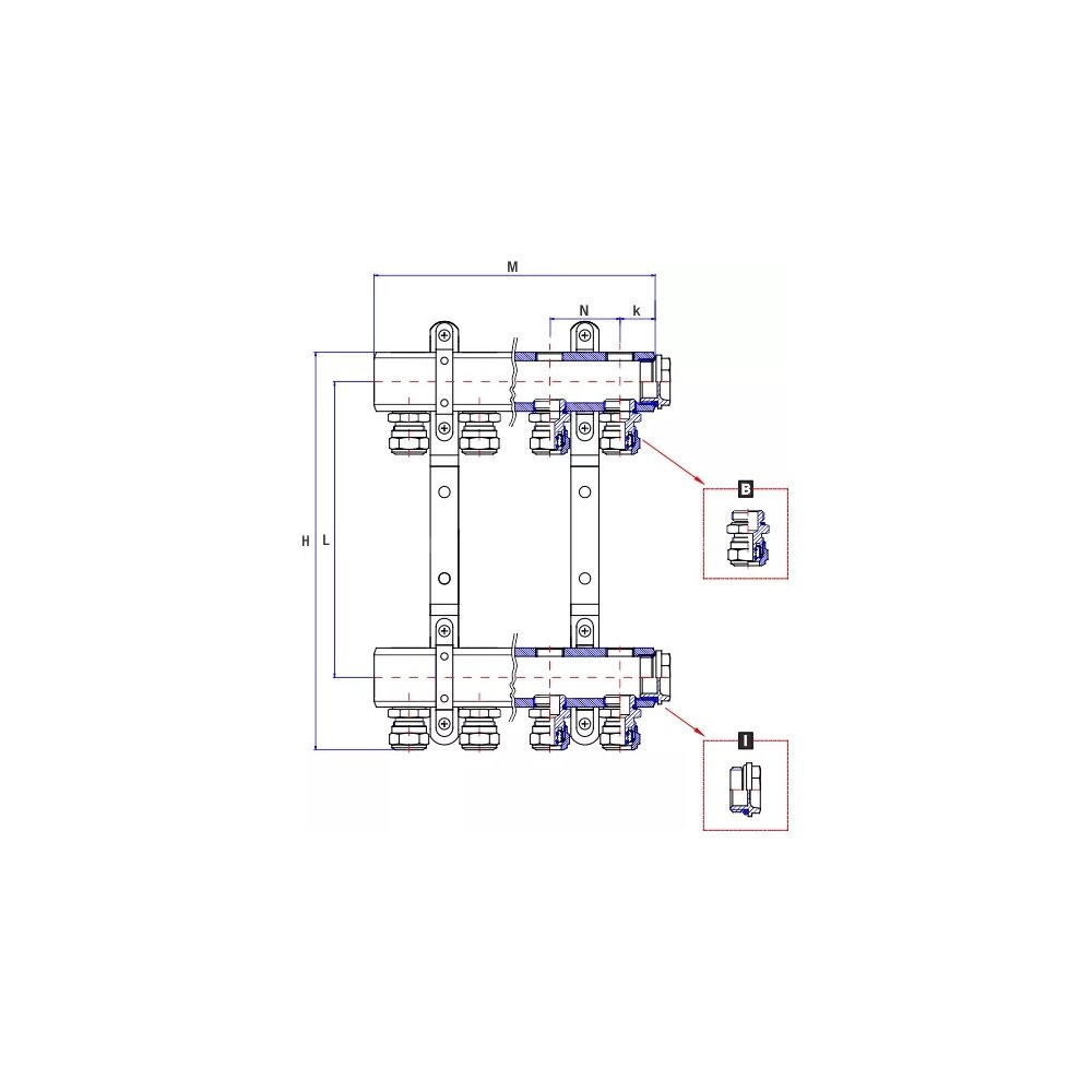 Rozdzielacze centralnego ogrzewania przeznaczone są do rozdzielenia medium grzewczego na poszczególne emitery (grzejniki). W skład rozdzielacza 50C wchodzą: belka zasilająca belka powrotna 2 uchwyty montażowe I - 2 korki 1” z o ringiem B - złączka skręcana G1/2" x Fi16