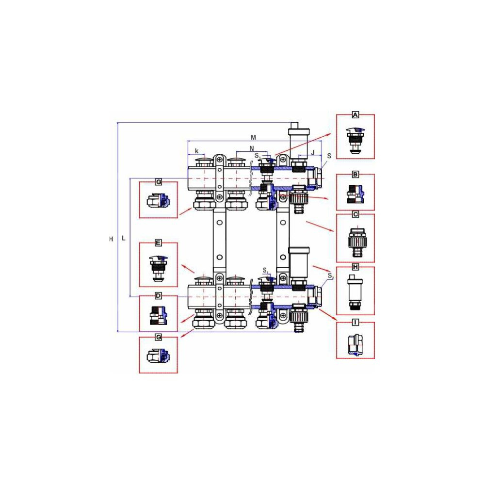 G - zaciski do rury pex/all/pex - belka powrotna z dodatkową sekcją wyposażoną w: