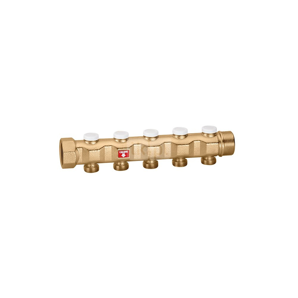 Rozdzielacz zasilający. Z zaworami do wstępnej regulacji natężenia przepływu. Przyłącze: G 1 1/4" (ISO 228-1) GW, wlot, Podłączenie do złączek Caleffi. Przyłącze: G 1 1/4" A (ISO 228-1) GZ, wylot. przyłącza wylot: G 3/4" A (ISO 228-1) GZ, 5 wyjść. Maksymalne ciśnienie pracy: 10 bar. Zakres temperatury medium: 5–100 °C. Rozstaw wyjść: 50 mm.