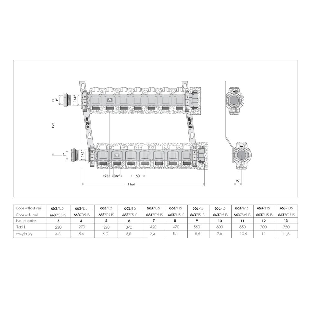 Zespół rozdzielaczy Zawiera: -1 rozdzielacz powrotny z zaworami odcinającymi, przystosowany do siłownika termoelektrycznego -1 rozdzielacz zasilający z zaworami odcinającymi do regulacji wstępnej natężenia przepływu; -2 uchwyty; -kod 658100; -2 złączki redukcyjne 1 1/4" GZ x 1" GW; -kod 364276; - 2 zakończenia rozdzielacza z korkami. Przyłącze: G 1 1/4" (ISO 228-1) GW, Podłączenie do złączek Caleffi. przyłącza wylot: G 3/4" A (ISO 228-1) GZ, 8 wyjść. Maksymalne ciśnienie pracy: 10 bar. Zakres temperatury medium: 5–100 °C. Rozstaw wyjść: 50 mm.