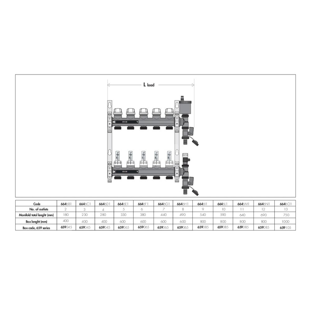Zespół rozdzielaczy Zawiera: - rozdzielacz powrotny z wbudowanymi zaworami odcinającymi do siłownika termoelektrycznego; - rozdzielacz zasilający z przepływomierzami o skali 0-5 l/min i zaworami regulacyjnymi; - zakończenia rozdzielacza z automatycznym zaworem odpowietrzającym i zaworem spustowym; - uchwyty montażowe z technopolimeru z regulowaną odległością od środka do użycia ze skrzynkami serii 659 lub do bezpośredniego mocowania na ścianie. główne podłączenie: G 1" (ISO 228-1) GW, Podłączenie do złączek Caleffi. przyłącza wylot: G 3/4" A (ISO 228-1) GZ, 2 wyjścia. Maksymalne ciśnienie pracy: 6 bar. Zakres temperatury medium: 5–60 °C. Rozstaw wyjść: 50 mm. Zakres regulacji natężenia przepływu: 0–5 l/min.