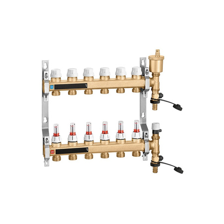 Zespół rozdzielaczy Zawiera: - rozdzielacz powrotny z wbudowanymi zaworami odcinającymi do siłownika termoelektrycznego; - rozdzielacz zasilający z przepływomierzami o skali 0-5 l/min i zaworami regulacyjnymi; - zakończenia rozdzielacza z automatycznym zaworem odpowietrzającym i zaworem spustowym; - uchwyty montażowe z technopolimeru z regulowaną odległością od środka do użycia ze skrzynkami serii 659 lub do bezpośredniego mocowania na ścianie. główne podłączenie: G 1" (ISO 228-1) GW, Podłączenie do złączek Caleffi. przyłącza wylot: G 3/4" A (ISO 228-1) GZ, 9 wyjść. Maksymalne ciśnienie pracy: 6 bar. Zakres temperatury medium: 5–60 °C. Rozstaw wyjść: 50 mm. Zakres regulacji natężenia przepływu: 0–5 l/min.