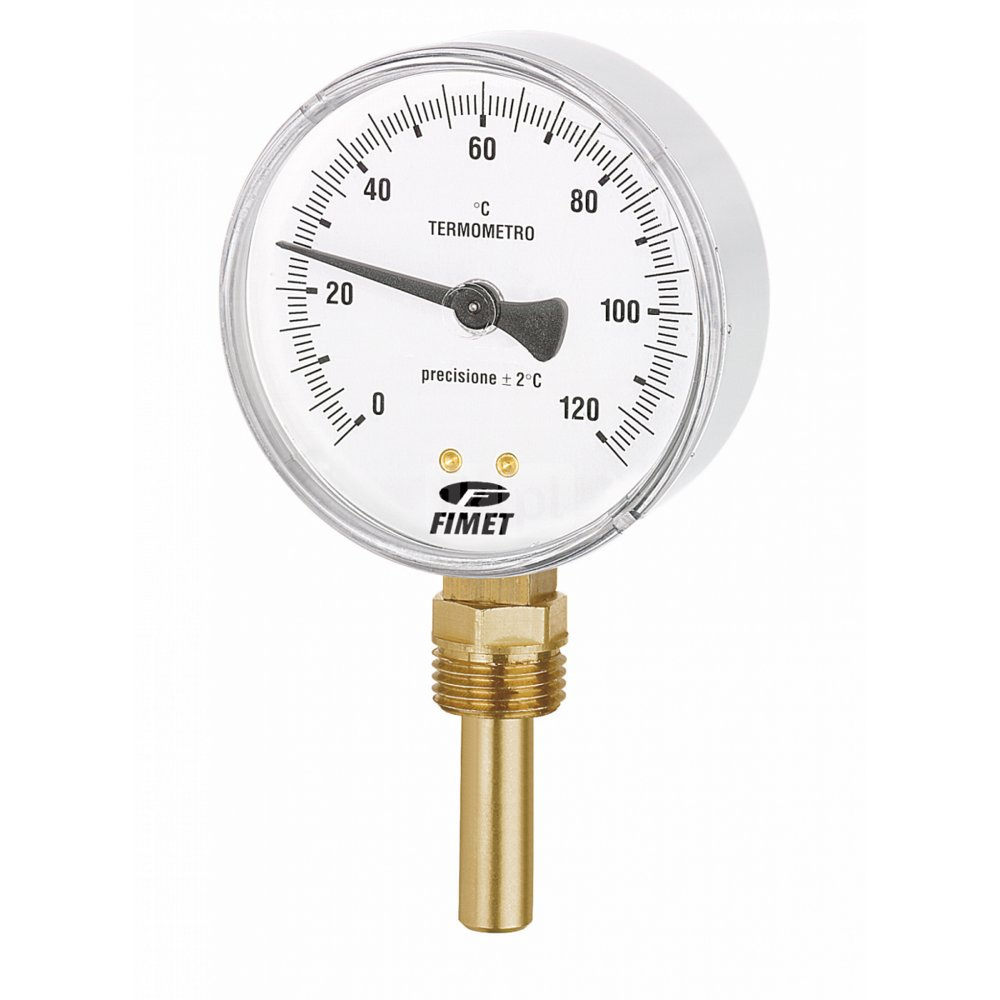 Termometr bimetaliczny DN 63 z podłączeniem wstecznym, z korpusem ze stali ocynkowanej do instalacji grzewczych, w komplecie z mosiężną kieszenią. Klasa dokładności 2. Wersje ze skalą 0÷120°C i 0÷140°C.