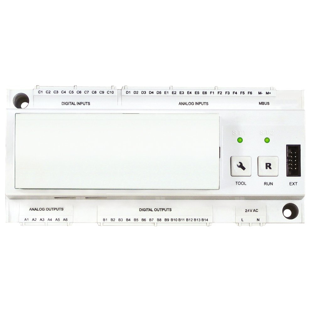 Sterownik mikroprocesorowy HERZ XF-5000 do kontroli i regulacji urządzeń technicznych domowych systemy takie jak ogrzewanie, chłodzenie, wentylacja i klimatyzatory. Swobodnie programowalny sterownik do przetwarzanie wejść i wyjść analogowych i cyfrowych Sygnały wyjściowe: 4 wejścia analogowe 0/4-20 mA,4 wejścia analogowe 0/2-10 V,5 wejść analogowych Pt1000,8 wejść cyfrowych 24 V DC, optycznie odłączone,4 wyjścia analogowe 0-10 V,8 wyjść cyfrowych 4 przekaźniki + 4 przekaźniki półprzewodnikowe. Port komunikacyjny MBUS.Komunikacja RS232/RS485 lub Ethernet.Komunikacja USB dla komputera PC. Wstępnie zaprogramowane dla wariantów: - stacje konwertujące w sposób bezpośredni lub pośredni, - sieci ciepłownicze,- stacja konwersji ciepłej wody sanitarnej z podgrzewaną wodą grzewczą,- zbiorniki ciepłej wody użytkowej, - systemy wentylacji lub klimatyzacji. Napięcie 230 V AC / 24 V AC +/- 10%, 50 Hz. Moc elektryczna maks. 15 W Temperatura otoczenia 0-50°C.Stopień ochrony IP 40.Montaż na szynie DIN 35 mm. Akcesoria opcjonalne należy zamawiać oddzielnie: - Jednostka sterująca z ekranem LCD F 7793 31 - Jednostka sterująca do zdalnego ustawiania F 7793 61.