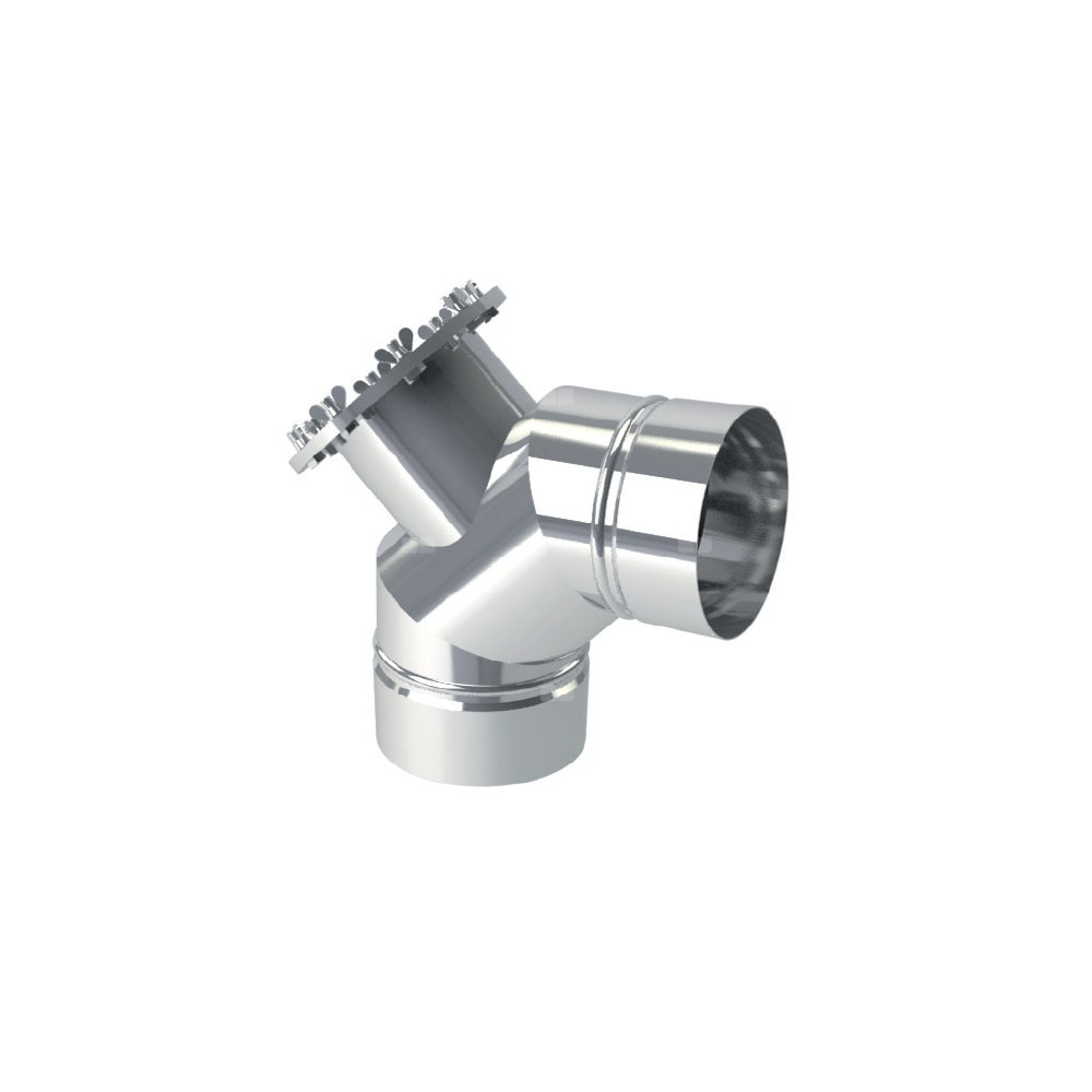 Kolano z wejściem flanszowym i rewizją LKRF 87° jest to element systemu jednościennego stożkowego MKS POWER. Kolano spawane tworzące łuk o kącie 87°.