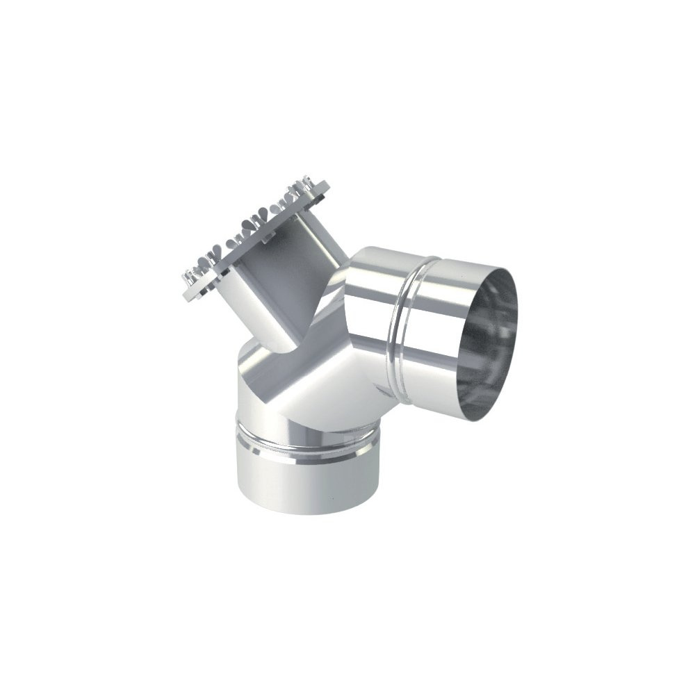 Kolano z wejściem flanszowym i rewizją LKRF 90° jest to element systemu jednościennego stożkowego MKS POWER. Kolano spawane tworzące łuk o kącie 90°.