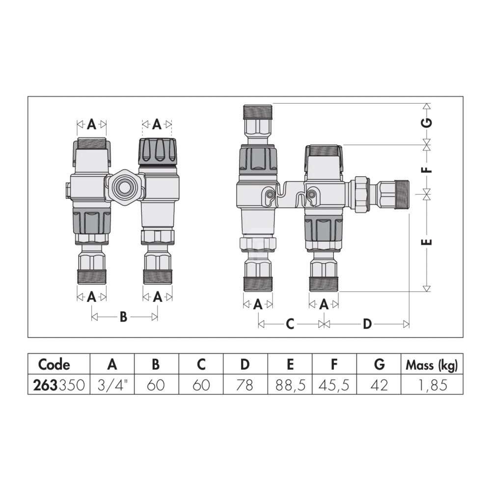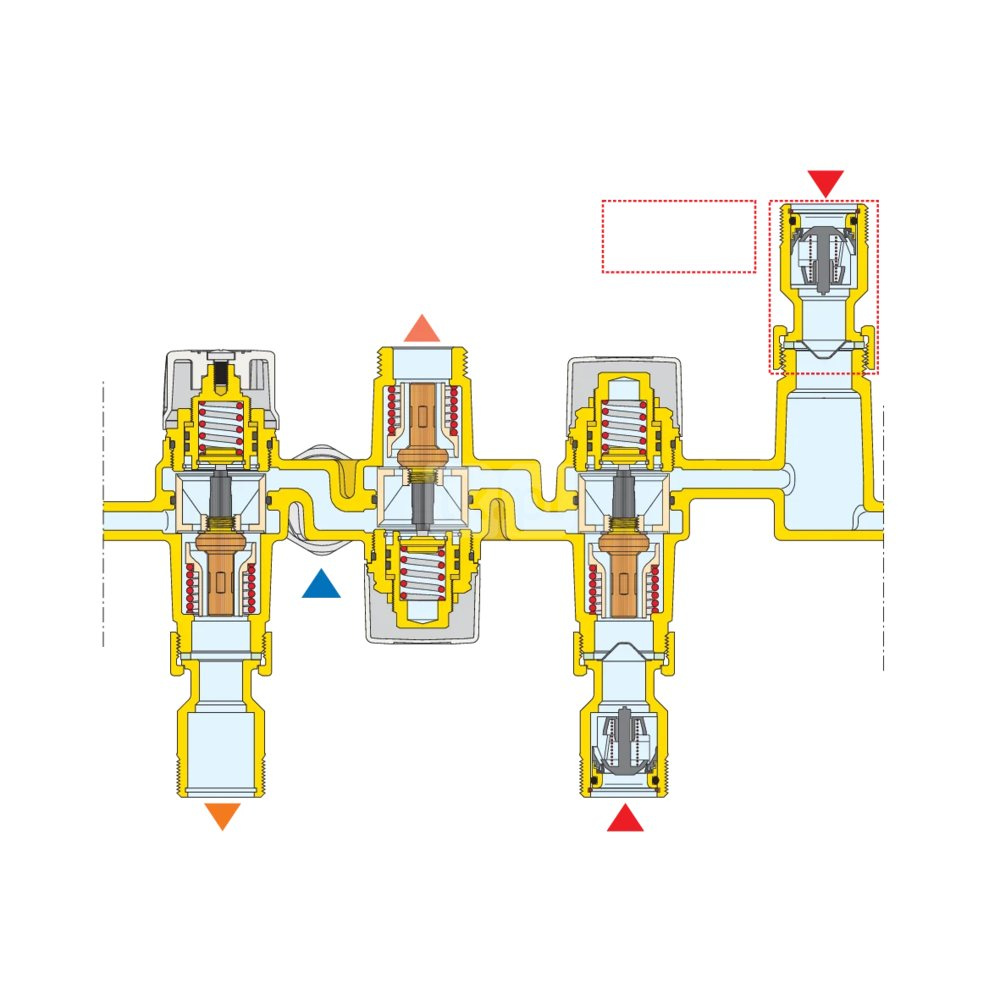 - termostatyczny antyoparzeniowy zawór mieszający regulowany przy użyciu pokrętła. Wyposażony w filtry i zawory zwrotne na wlotach;