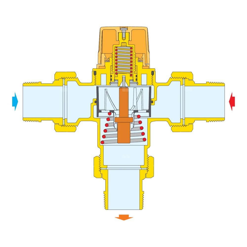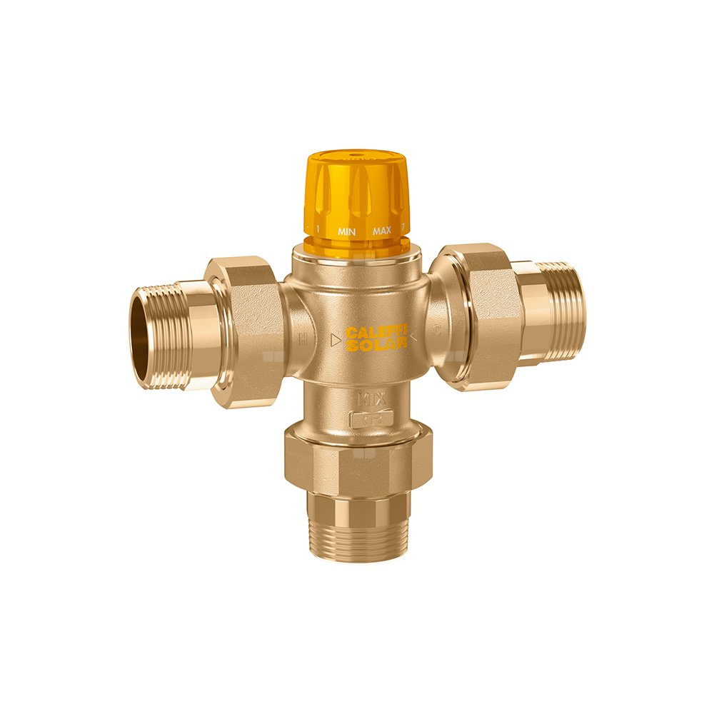Termostatyczny zawór mieszający do scentralizowanych instalacji solarnych Wewnętrzny element regulacyjny wykonany z technopolimeru zabezpieczony przed osadzaniem kamienia. Przyłącze: R 1" (EN 10226-1) GZ, złączka. Maksymalne ciśnienie pracy: 14 bar. Zakres temperatury medium: 0–100 °C. Zakres regulacji temperatury: 35–65 °C. Kv: 5,5 m³/h. Materiał: stop mosiądzu odporny na odcynkowanie.