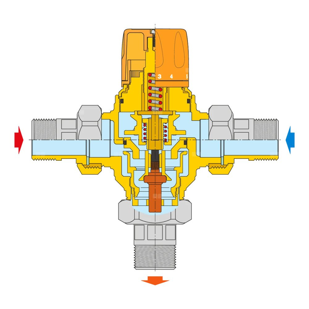 Termostatyczny zawór mieszający, z wymiennym wkładem, do instalacji solarnych Przyłącze: G 3/4" A (ISO 228-1) GZ, złączka. Maksymalne ciśnienie pracy: 14 bar. Zakres temperatury medium: 0–110 °C. Zakres regulacji temperatury: 30–65 °C. Kv: 4,5 m³/h. Materiał: mosiądz.
