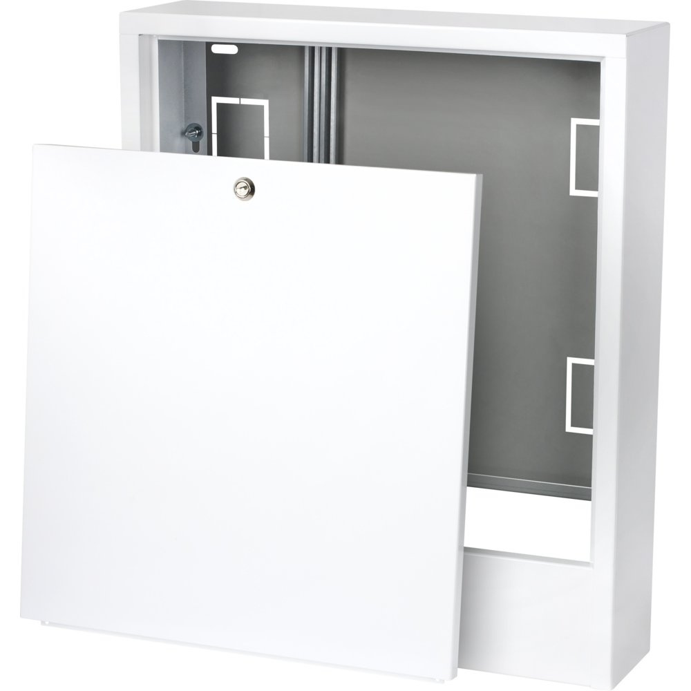 Szafka instalacyjna natynkowa o głębokości 120 mm, wykonana w całości z blachy stalowej ocynkowanej o grubości 0,8 mm malowana proszkowo w kolorze RAL 9003. Front wyposażony jest w zamek monetowy, zdejmowany tył szafki umożliwia wygodny montaż. Dostarczana z 2 prowadnicami do montażu rozdzielacza oraz z 2 kompletami montażowych śrub zamkowych o różnych długościach.