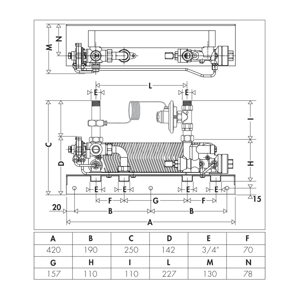 Mechaniczna stacja naścienna. Maksymalne ciśnienie pracy: 10 bar. Maksymalna temperatura pracy: 85 °C. Nominalna moc wymiennika ciepła: 40 kW. Głębokość: 130 mm. Wysokość: 250 mm. Szerokość: 420 mm. Maksymalny wydatek c.w.u.: 18 l/min. △p max.: 2 bar (obieg pierwotny).