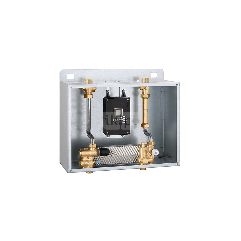 Naścienna stacja mieszkaniowa do przygotowania c.w.u. Podstawowe elementy składowe: - modulowany zawór regulacyjny; - wysokowydajna pompa obiegu pierwotnego ; - skrzynka z blachy lakierowanej RAL9010; - lutowany wymiennik o mocy nominalnej 40, 65 lub 75 kW ; Maksymalna temperatura pracy: 85 °C. Zasilanie elektryczne: 230 V (AC). Pobór mocy: 80 W. Nominalna moc wymiennika ciepła: 75 kW. Głębokość: 188 mm. Wysokość: 350 mm. Szerokość: 476 mm. Maksymalny wydatek c.w.u.: 27 l/min. △p max.: 0,9 bar (obieg pierwotny).