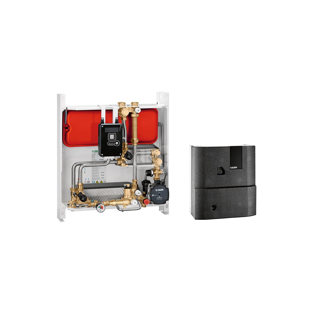 Naścienna stacja mieszkaniowa Podstawowe elementy składowe: - modulowane zawory regulacyjne; - czujnik bezpieczeństwa temperatury ogrzewania płaszczynowego; - wysokowydajna pompa obiegowa; - izolacja z PPE; - lutowany wymiennik na potrzeby przygotowania c.w.u. ; - lutowany wymiennik na potrzeby c.o. o mocy nominalne 15 kW; - zawór bezpieczeństwa 3 bar; - naczynie przeponowe o pojemności 7 l; Maksymalne ciśnienie pracy: 16 bar. Zakres regulacji temperatury: 45–75 °C. Zasilanie elektryczne: 230 V (AC). Pobór mocy: 80 W. Nominalna moc wymiennika ciepła: 65 kW. Głębokość: 265 mm. Wysokość: 630 mm. Szerokość: 550 mm. Maksymalny wydatek c.w.u.: 27 l/min. △p max.: 1,65 bar.