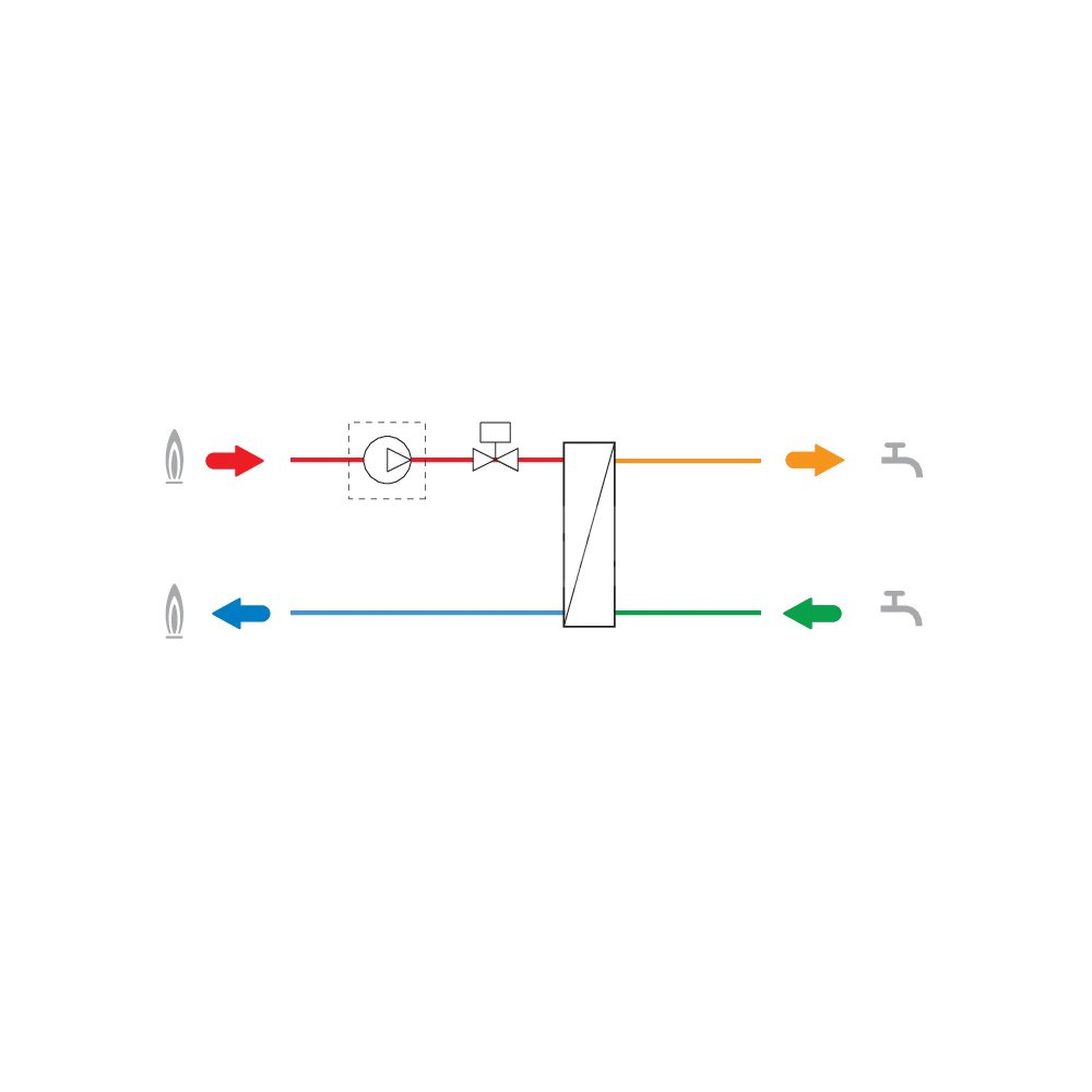 Naścienna stacja mieszkaniowa do przygotowania c.w.u. Podstawowe elementy składowe: - modulowany zawór regulacyjny; - wysokowydajna pompa obiegu pierwotnego ; - skrzynka z blachy lakierowanej RAL9010; - lutowany wymiennik o mocy nominalnej 40, 65 lub 75 kW ; Maksymalna temperatura pracy: 85 °C. Zasilanie elektryczne: 230 V (AC). Pobór mocy: 80 W. Nominalna moc wymiennika ciepła: 75 kW. Głębokość: 188 mm. Wysokość: 350 mm. Szerokość: 476 mm. Maksymalny wydatek c.w.u.: 27 l/min. △p max.: 0,9 bar (obieg pierwotny).