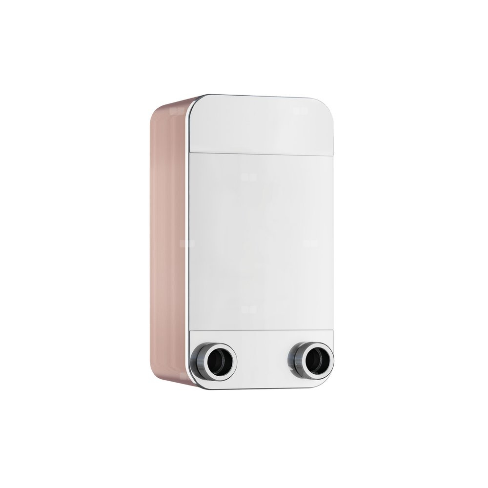 lutowany dwubiegowy płytowy wymiennik ciepła ze stali nierdzewnej (1.4404), lutowany próżniowo miedzią. Wielkości R..B-14 do R..B-110 z przyłączem gwintowanym, R..B-235 z przyłączem kołnierzowym DIN.
