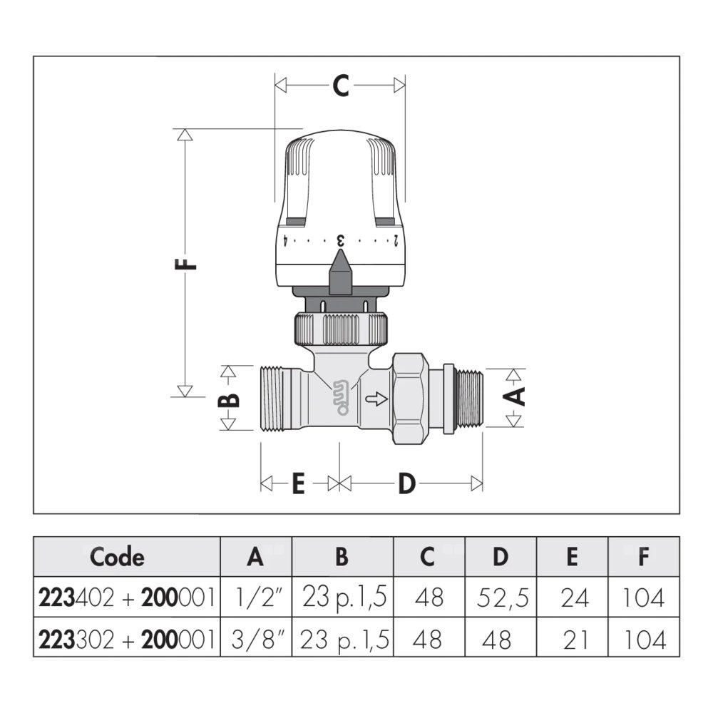 Prosty grzejnikowy zawór termostatyczny przystosowany do montażu głowic termostatycznych lub siłowników termoelektrycznych. Do rur miedzianych i z tworzyw sztucznych jedno- i wielowarstwowych. podłącznie rury: 23 p. 1,5, wlot, podłączenie proste, Podłączenie do złączek Caleffi. podłączenie grzejnika: G 3/8" A (ISO 228-1) GZ, wylot, podłączenie proste. Maksymalne ciśnienie pracy: 10 bar. Zakres temperatury medium: 5–100 °C. Wykończenie: chromowane. Kvs: 1,05 m³/h. Materiał: mosiądz.