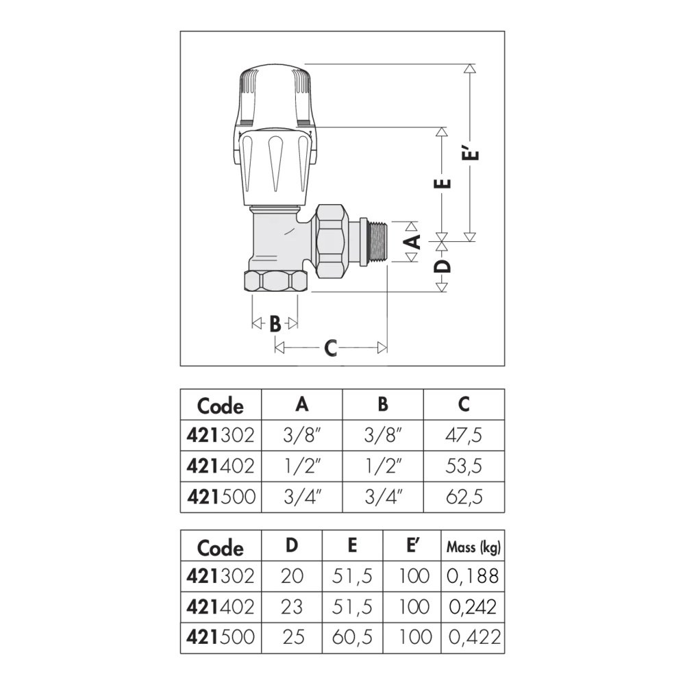 Kątowy grzejnikowy zawór termostatyczny z pokrętłem, przystosowany do montażu głowic termostatycznych, elektronicznych i siłowników termoelektrycznych podłącznie rury: G 3/8" (ISO 228-1) GW, wlot, podłączenie kątowe. podłączenie grzejnika: G 3/8" A (ISO 228-1) GZ, wylot, podłączenie kątowe. Maksymalne ciśnienie pracy: 10 bar. Zakres temperatury medium: 5–100 °C. Wykończenie: chromowane. Materiał: mosiądz.