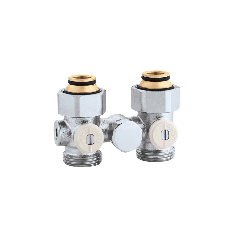 Podwójny, prosty zawór podłączeniowy do grzejników płytowych podłącznie rury: G 3/4" (ISO 228-1) GW, wlot, Podłączenie do złączek Caleffi. podłączenie grzejnika: G 3/4" (ISO 228-1) GW, wylot. Maksymalne ciśnienie pracy: 10 bar. Zakres temperatury medium: 5–100 °C.