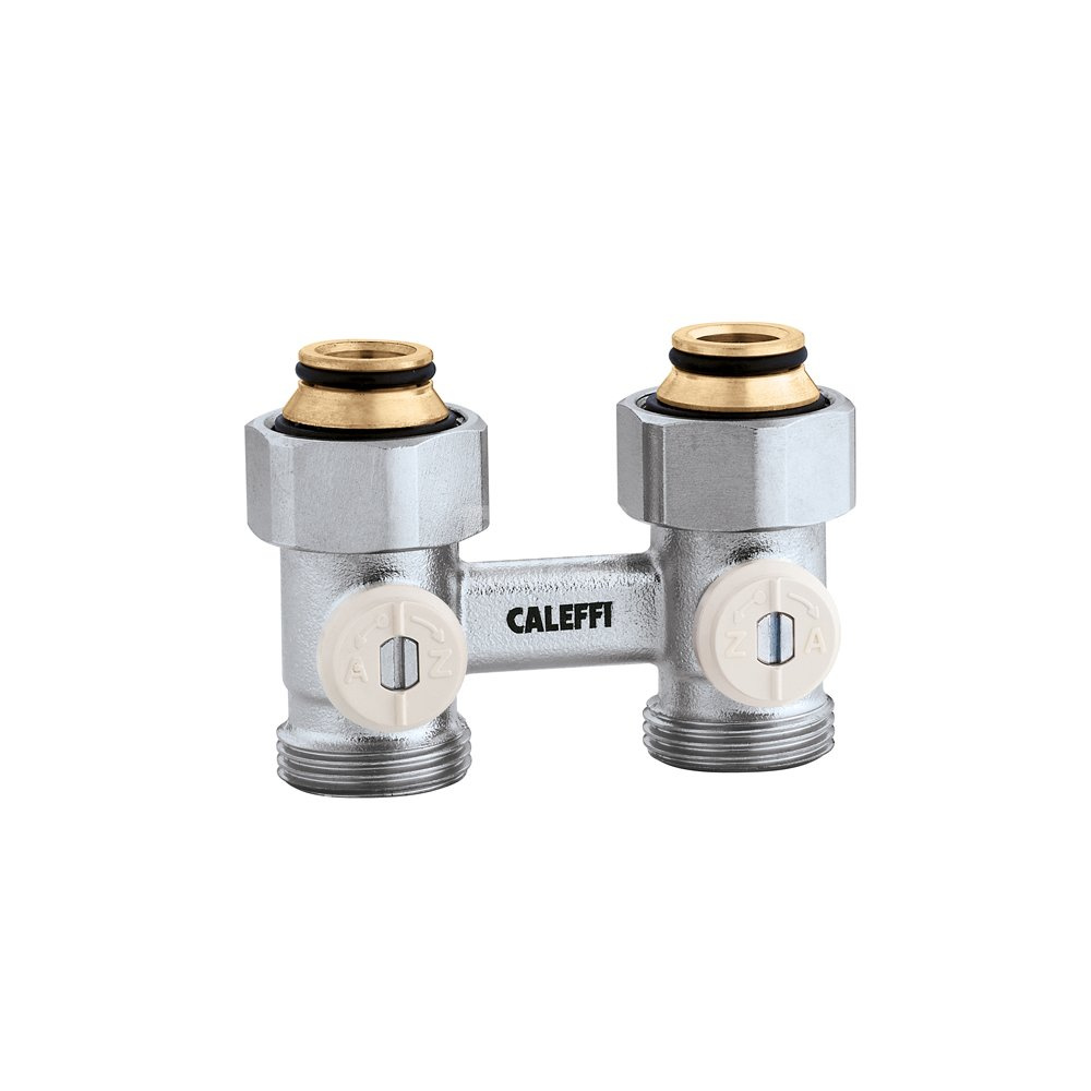 Podwójny, prosty zawór podłączeniowy do grzejników płytowych podłącznie rury: G 3/4" A (ISO 228-1) GZ, wlot, Podłączenie do złączek Caleffi. podłączenie grzejnika: G 3/4" (ISO 228-1) GW, wylot. Maksymalne ciśnienie pracy: 10 bar. Zakres temperatury medium: 5–100 °C.