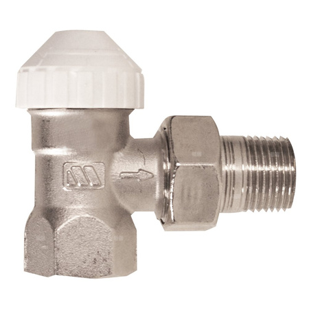 Kątowy zawór termostatyczny z nastawą wstępną, niklowany, gwint wewnętrzny, przeznaczony do montażu głowicy termostatycznej serii 148.