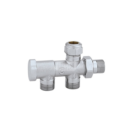 Zawór grzejnikowy do instalacji dwururowych Z przyłączem do elementu łączącego Element łączący Ø 15 mm (seria 454). Przyłącza podłogowe. podłącznie rury: 23 p. 1,5, wlot, Podłączenie do złączek Caleffi. podłączenie grzejnika: 23 p. 1,5, wylot. Maksymalne ciśnienie pracy: 10 bar. Zakres temperatury medium: 5–100 °C. Rozstaw przyłączy głównych: 40 mm. Wykończenie: chromowane. Kv: 1,8 m³/h. Materiał: mosiądz.